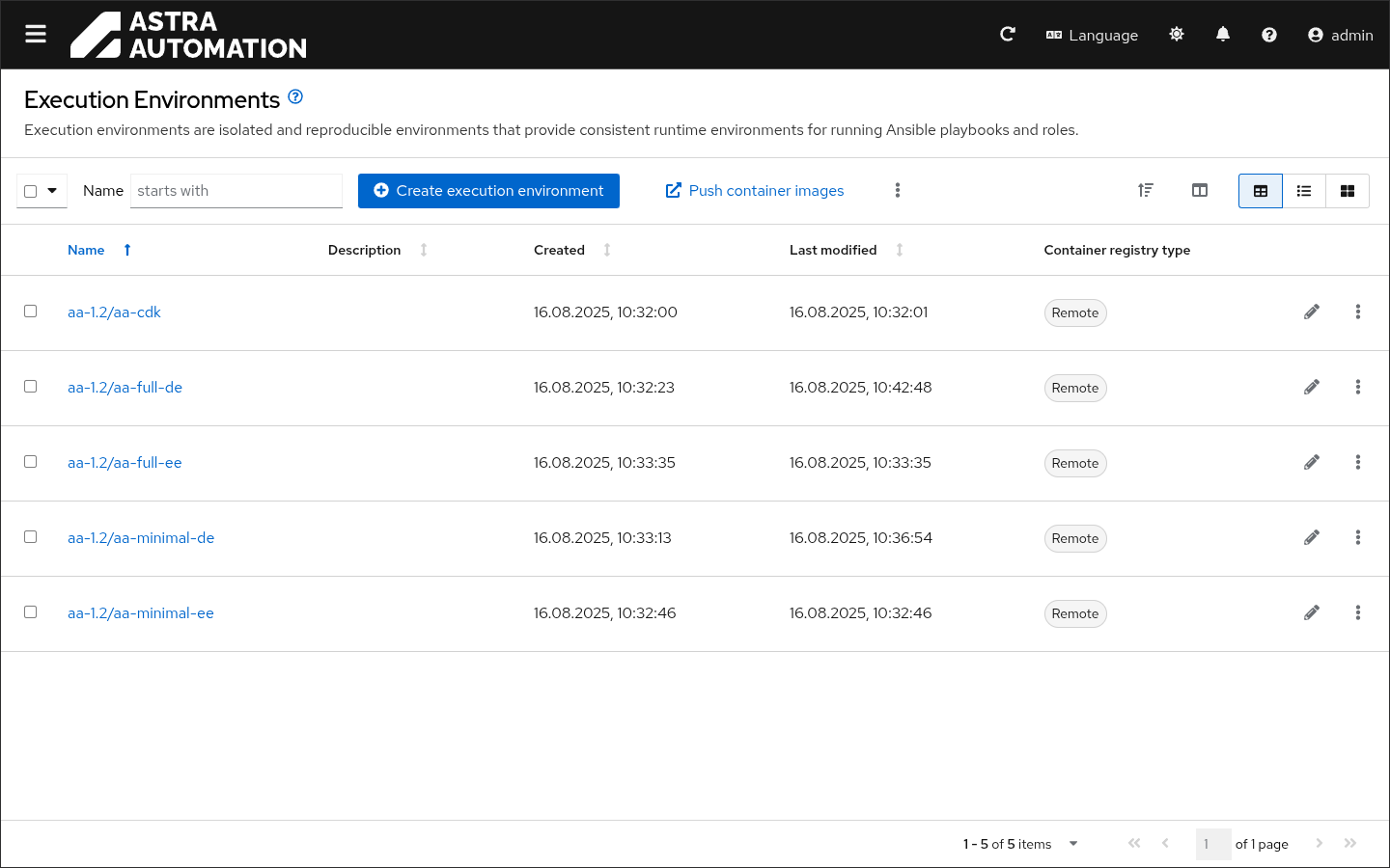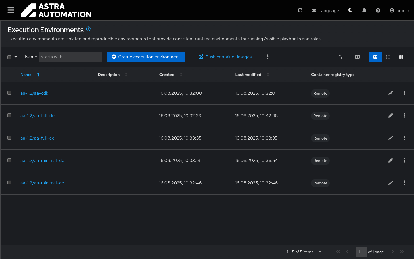 Окно Среды исполнения (Execution Environments) предоставляет интерфейс для управления образами сред исполнения и сред принятия решений, применяемых платформой автоматизации, с помощью следующих операций: