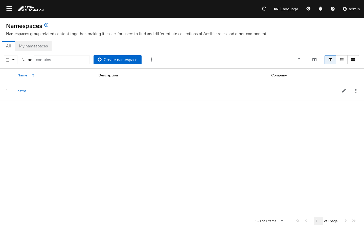 Все (All) – все пространства имен, существующие в Private Automation Hub.