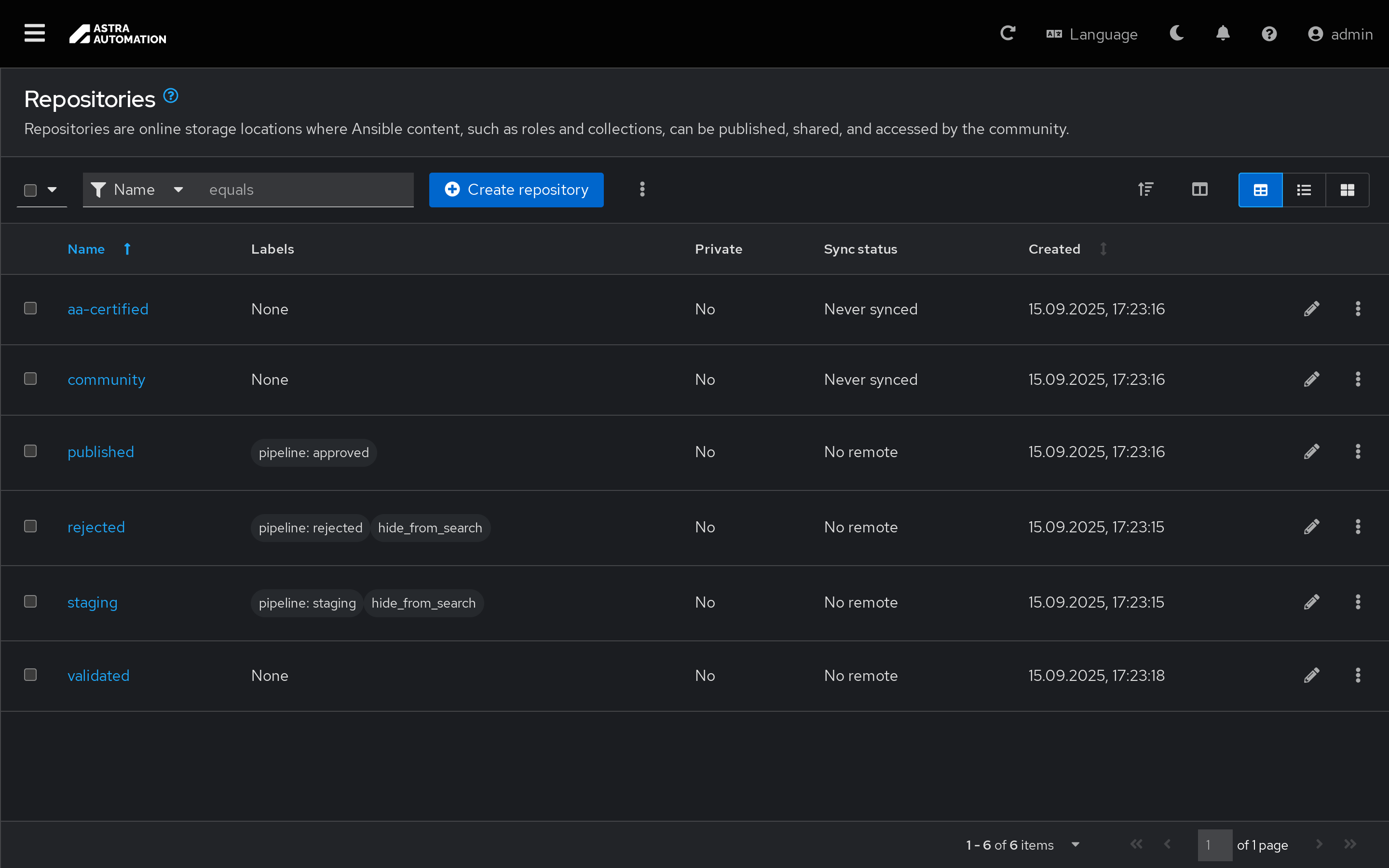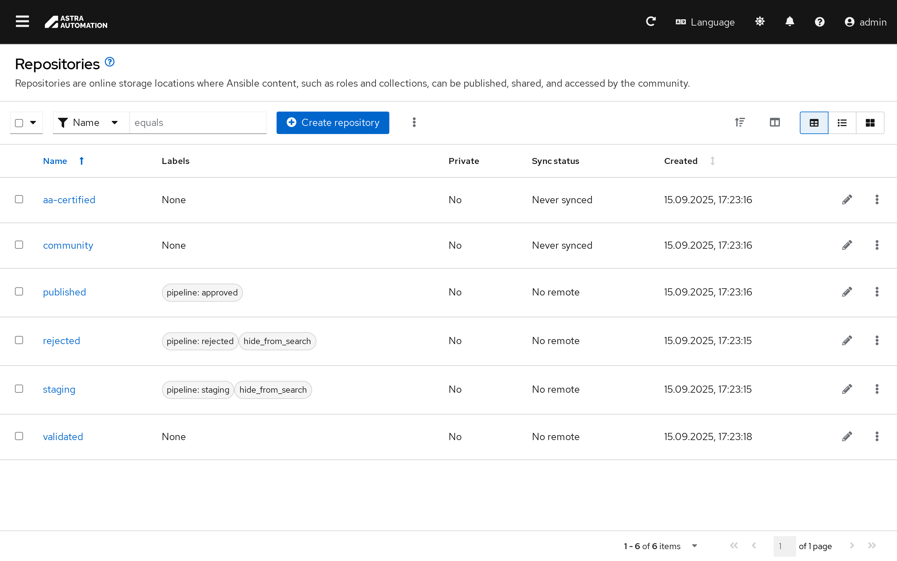 Промежуточный (Staging) – хранящиеся в репозитории версии коллекций недоступны пользователям и ожидают согласования. Загружать версии коллекций в этот репозиторий могут любые пользователи, имеющие привилегии на загрузку содержимого в пространства имен.