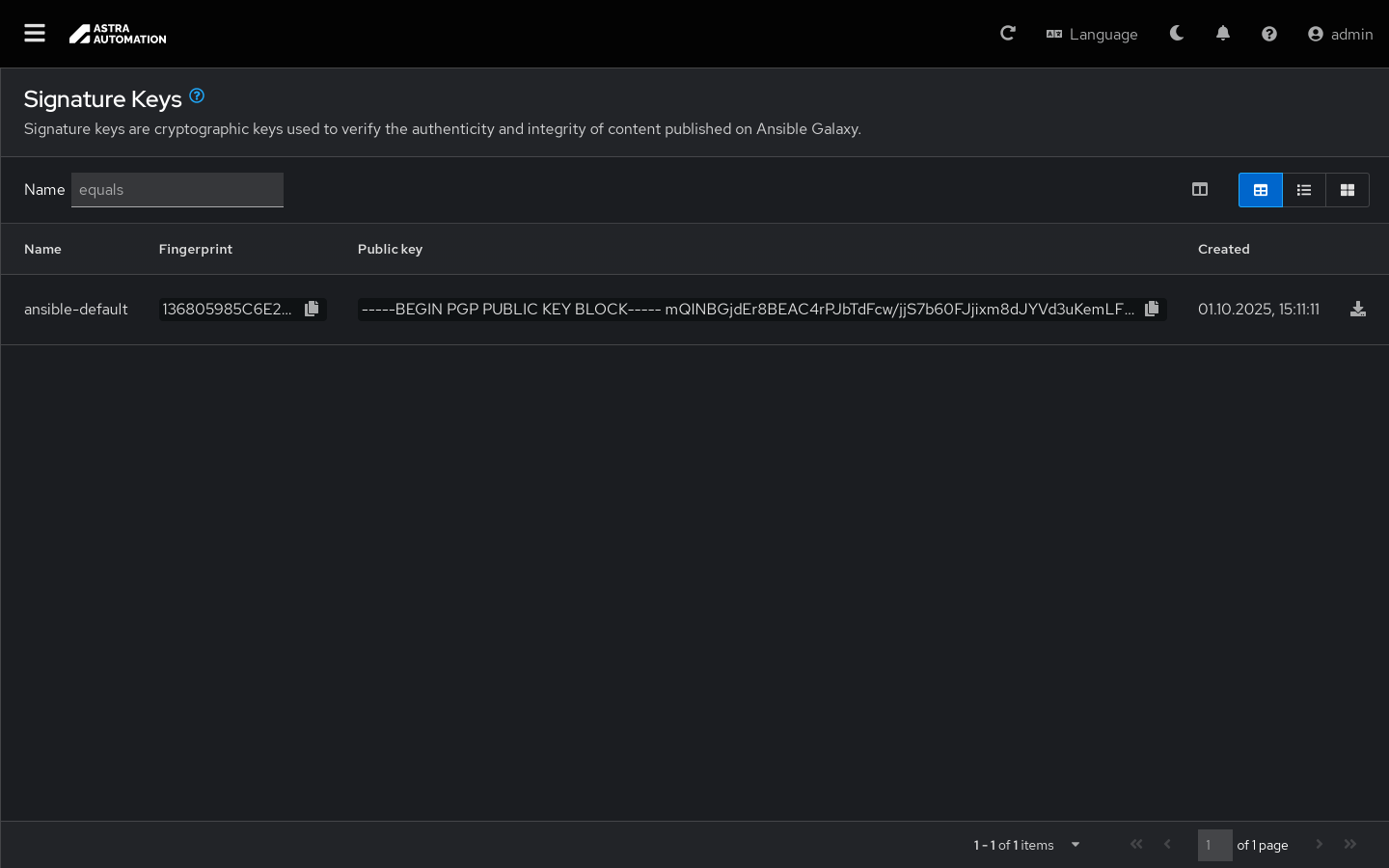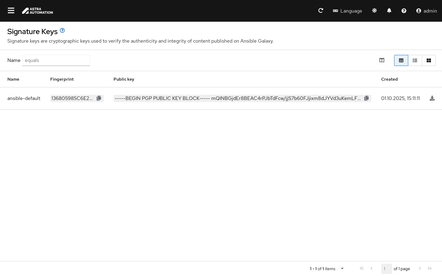 UI платформы не поддерживает создание ключей для подписи коллекций, поэтому ключи необходимо сгенерировать вручную с помощью утилиты GPG, как описано в инструкции по сознанию ключа подписи.