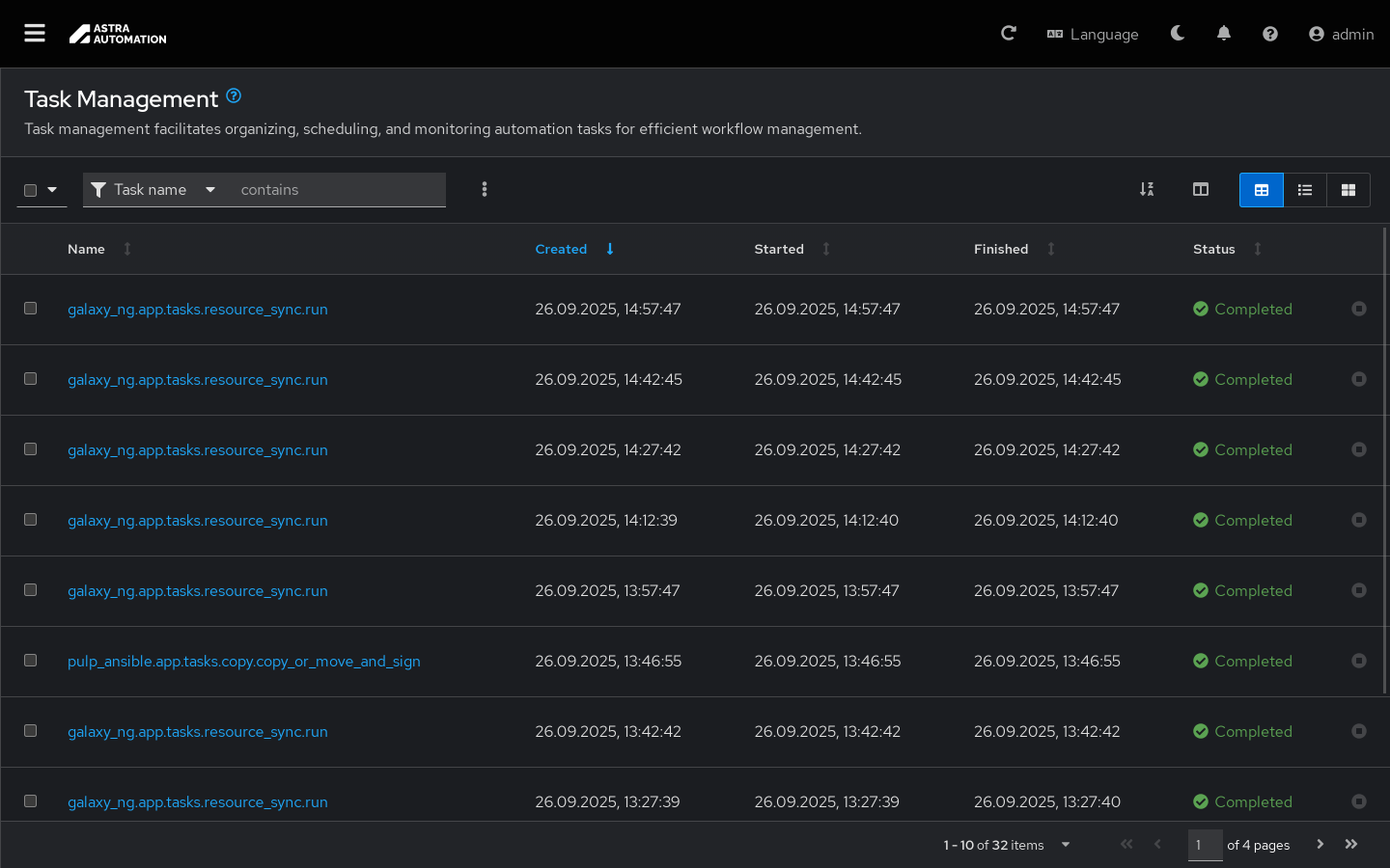 Окно Управление задачами (Task management) предоставляет средства мониторинга внутренних фоновых процессов Private Automation Hub: