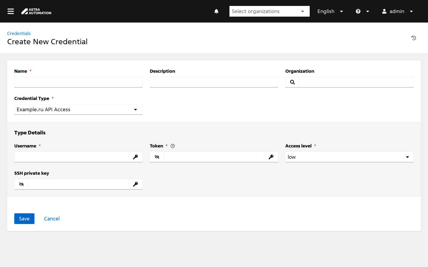 label– название поля при заполнении сведений о полномочии через графический интерфейс.help_text– подсказка, которая выводится рядом с полем при заполнении сведений о полномочии через графический интерфейс.secret– если равноtrue, вводимое значение является секретом.Для защиты секретов в полях ввода используется маскировка символов, а в таблице базы данных Automation Controller – защитное преобразование.