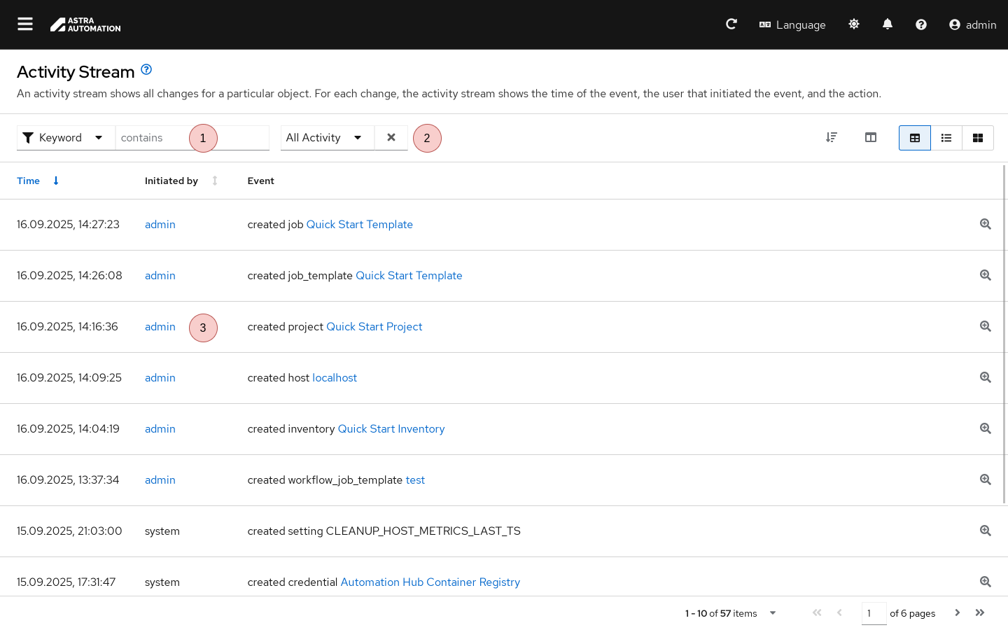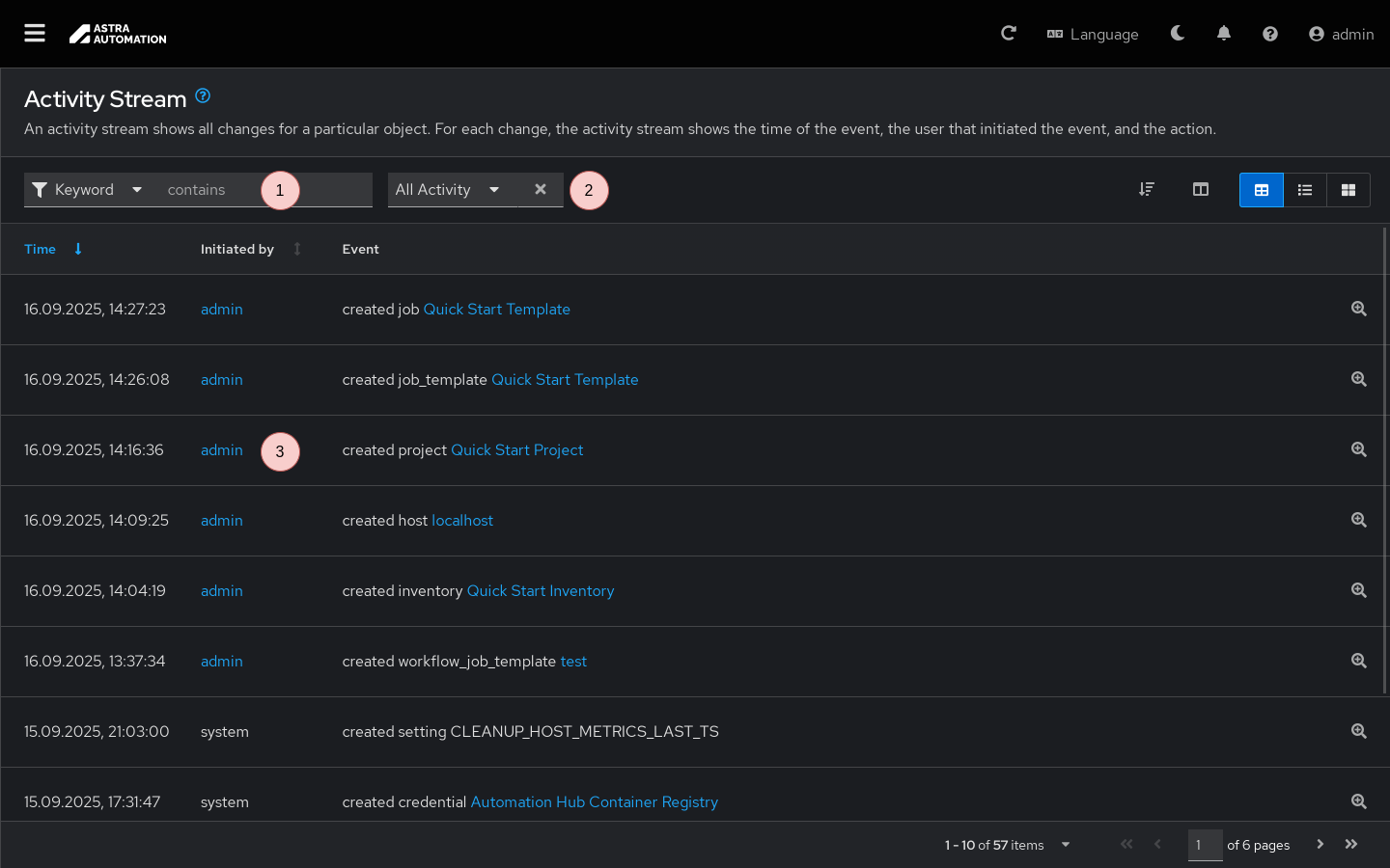 Окно Поток активности (Activity Stream) используется для просмотра информации о действиях, выполненных внутри Automation Controller. Для перехода к нему выберите на панели навигации ().
