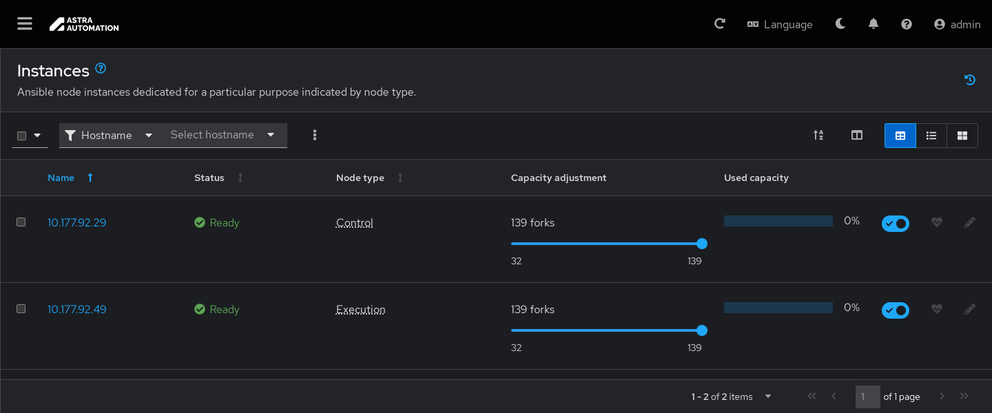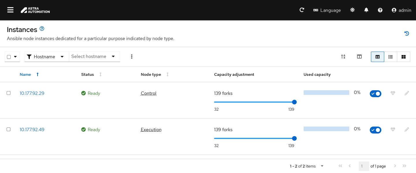 Окно Узлы (Instances) используется для просмотра статуса узлов системы автоматизации процессов и запуска диагностических команд. В систему входят узлы плоскости управления (Control Plane, Controller) и плоскости исполнения (Execution Plane). Для перехода к нему выберите на панели навигации ().