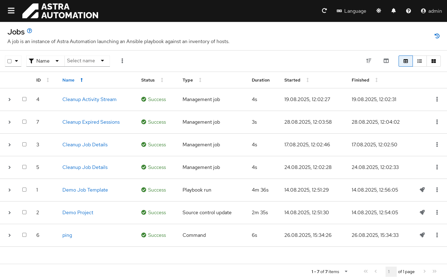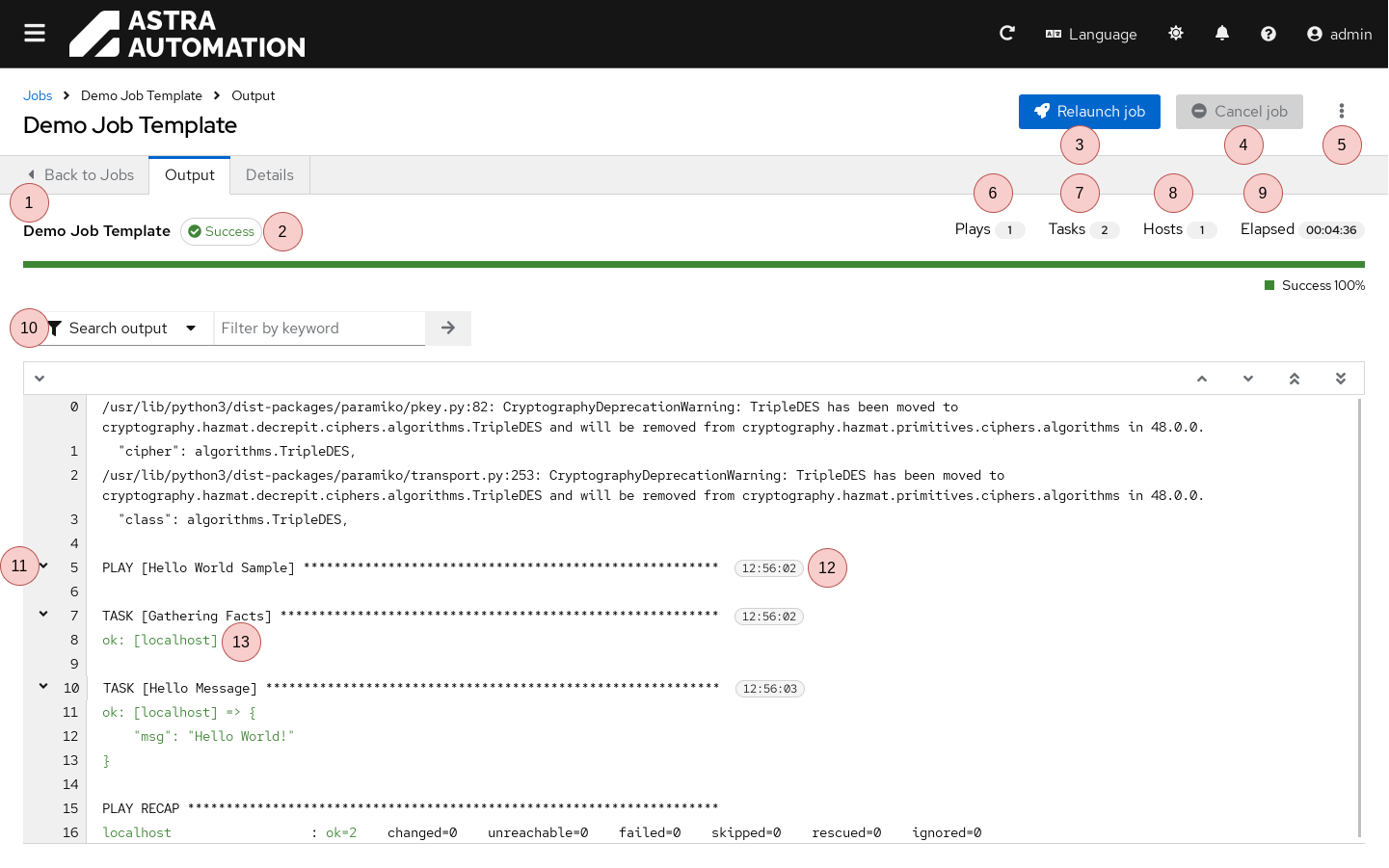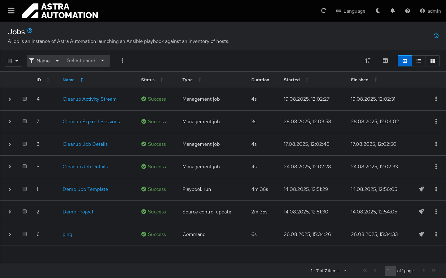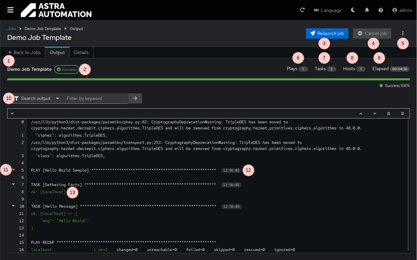 Для просмотра вывода Ansible нажмите на ссылку с названием задания в таблице заданий. Для заданий в статусе «Выполнение» (Running) используется вывод в реальном времени.