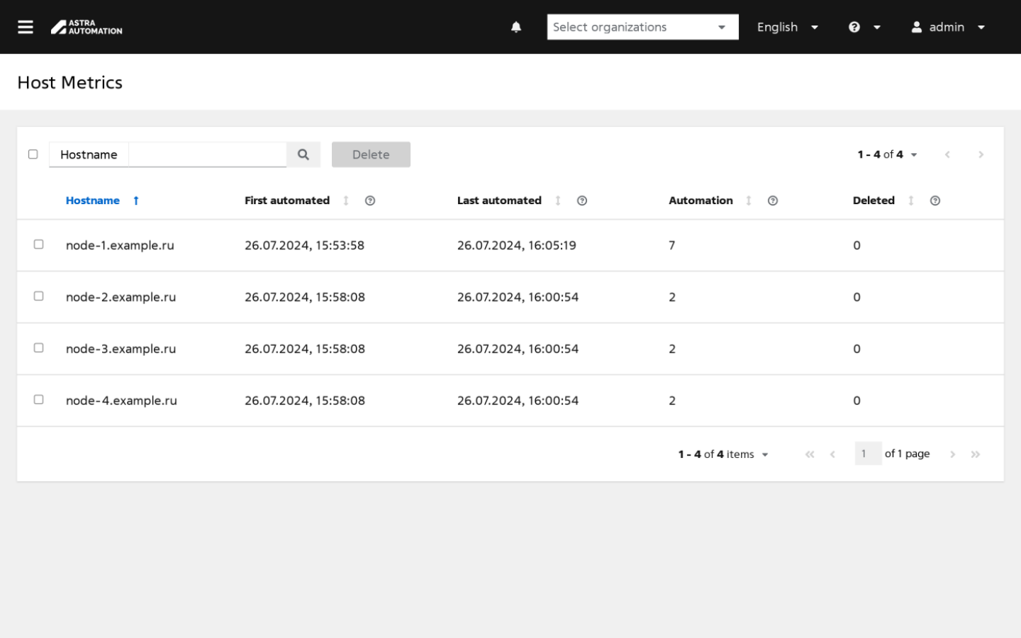 Окно Метрики узлов (Host Metrics) используется для вывода статистической информации о запуске заданий автоматизации на управляемых узлах. Для перехода к нему выберите на панели навигации ().