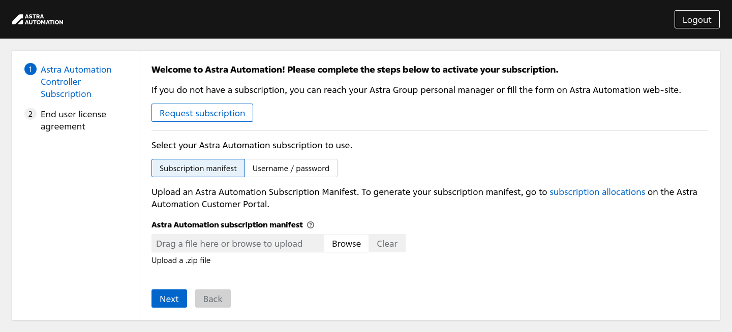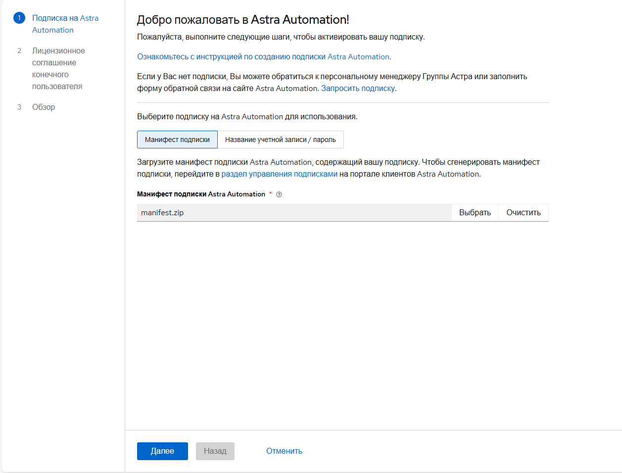 В поле Манифест подписки Astra Automation (Astra Automation subscription manifest) выберите ZIP-архив с файлом манифеста, загруженный ранее из Личного кабинета.
