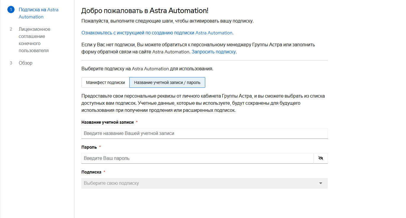 Для разблокировки всех возможностей платформы необходимо иметь активированную подписку на Astra Automation. Управление подпиской включает следующие шаги: