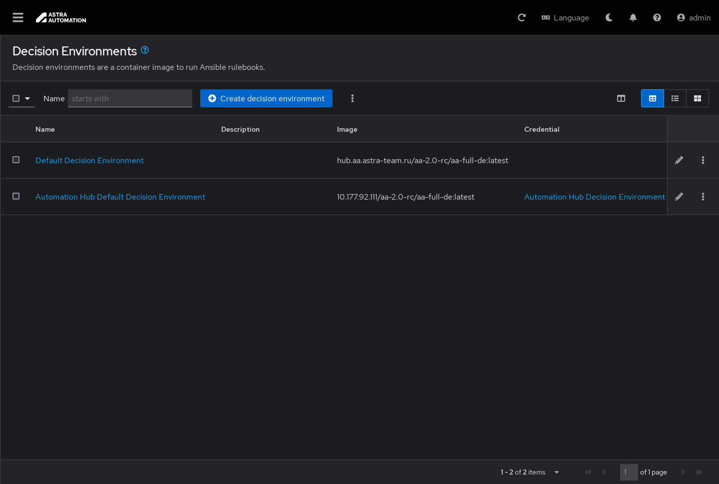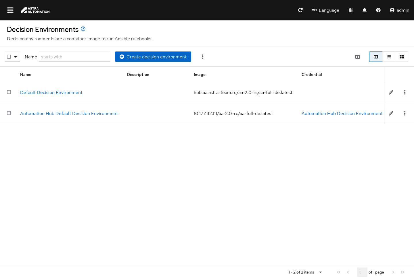 Окно Среды принятия решений (Decision Environments) позволяет управлять контейнеризованными окружениями, в которых выполняются своды правил Event-Driven Automation, с помощью следующих операций: