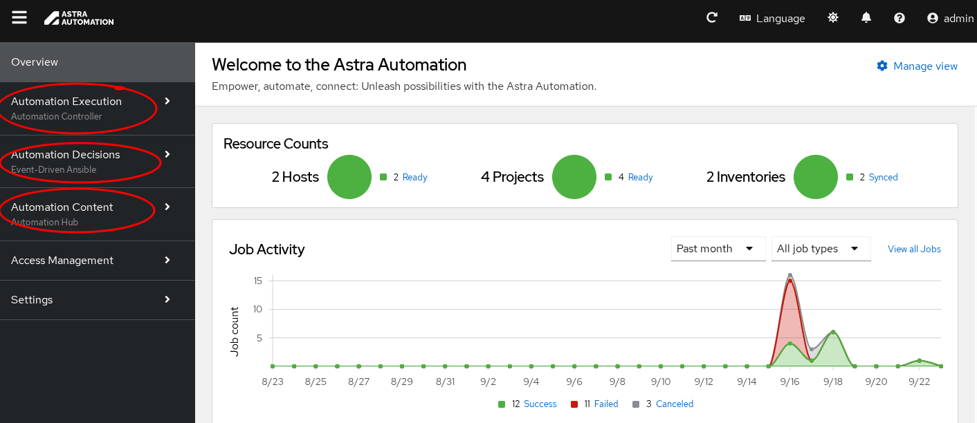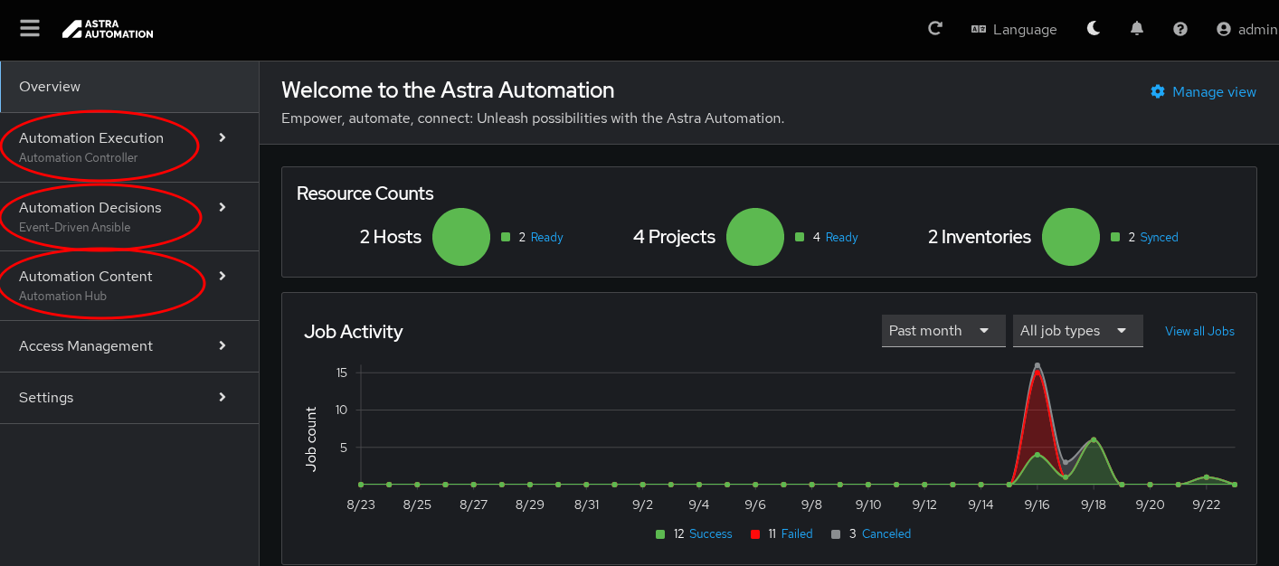 Автоматизация процессов (Automation Execution) – создание и управление заданиями по автоматизации процессов в управляемых узлах с помощью проектов автоматизации, предоставляющих сборники сценариев автоматизации (playbooks). Создание ресурсов автоматизации и их применение реализуется через Automation Controller.