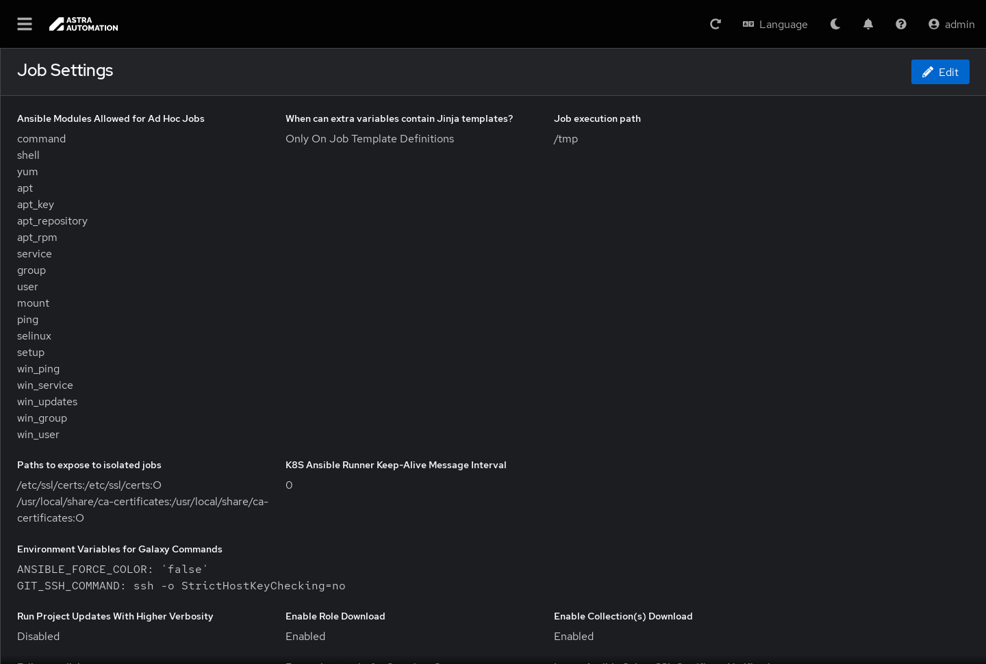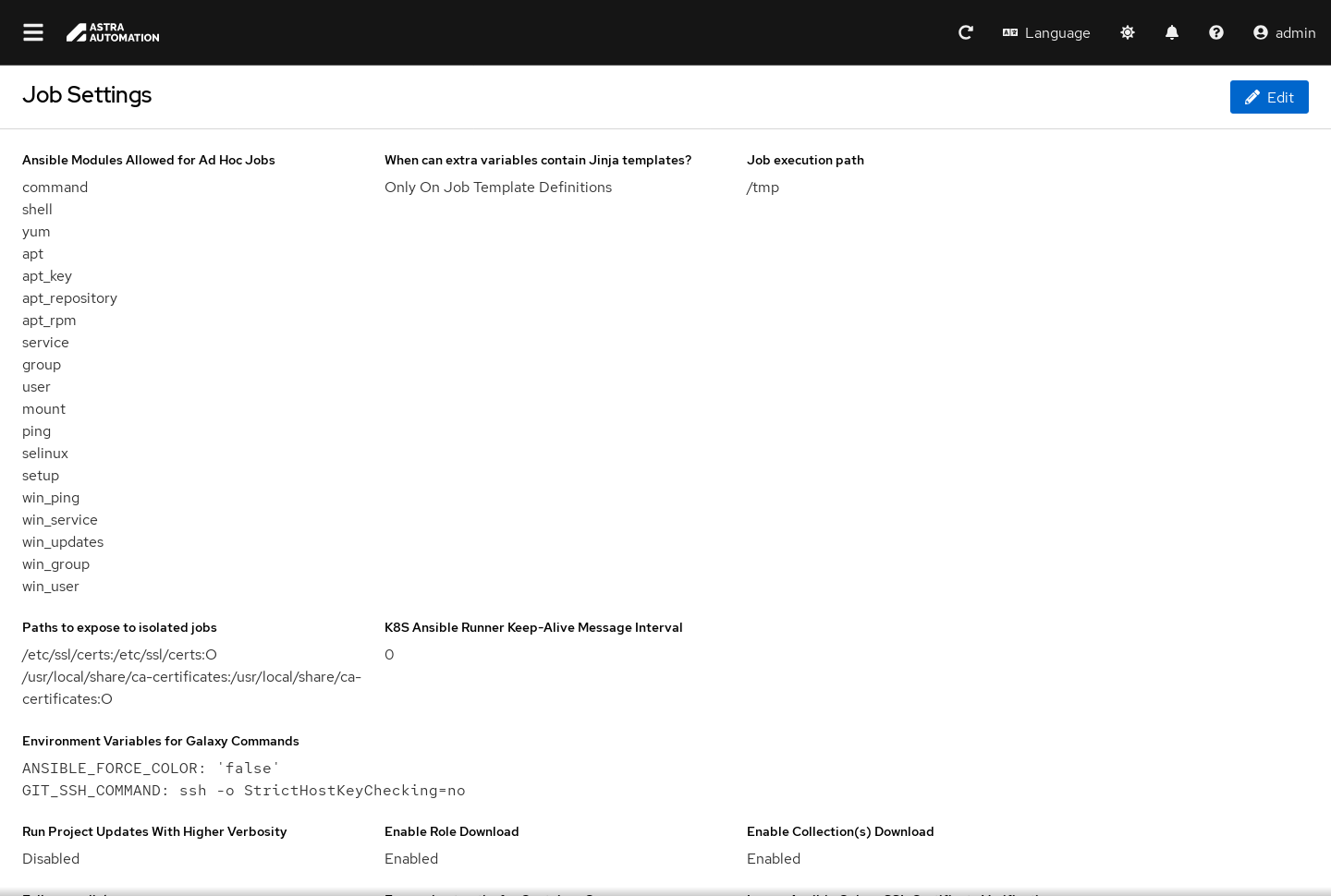 0.Default Job Idle Timeout – если за указанный период времени в секундах не происходит вывода Ansible, исполнение задания прерывается. При значении