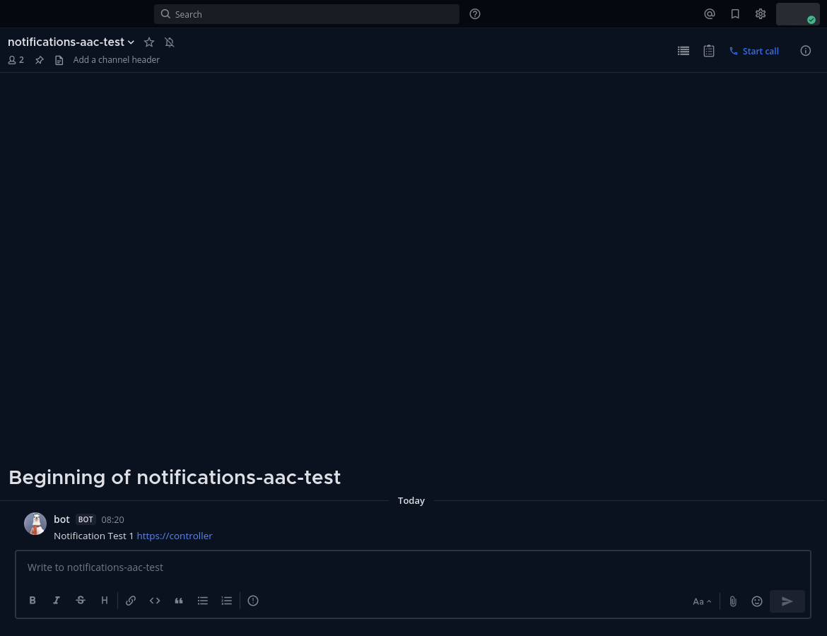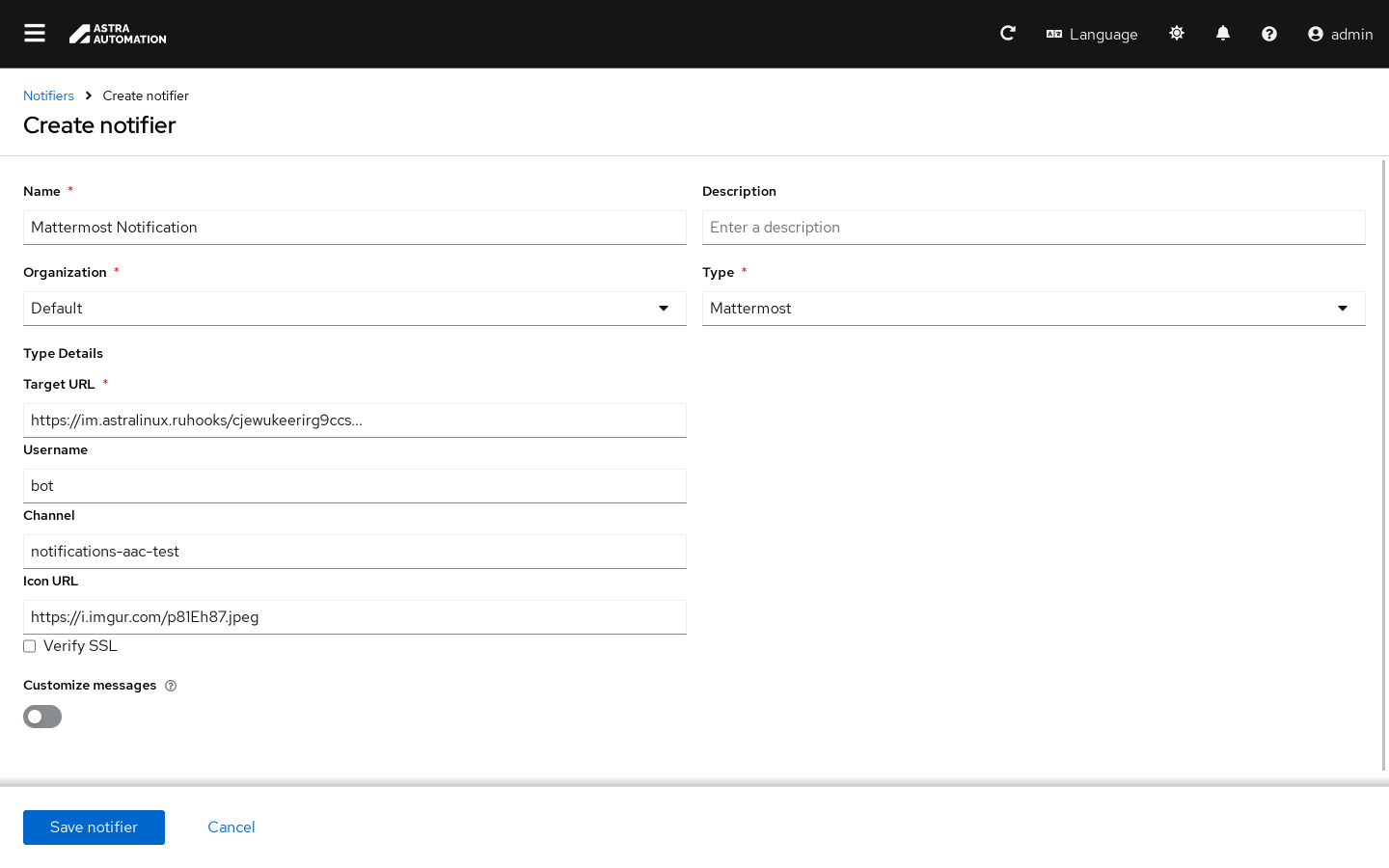 После сохранения откроется окно с созданным уведомлением, в котором можно проверить его работоспособность, нажав кнопку Тестовое уведомление (Test notifier). В канал Mattermost направляется уведомление следующего вида: